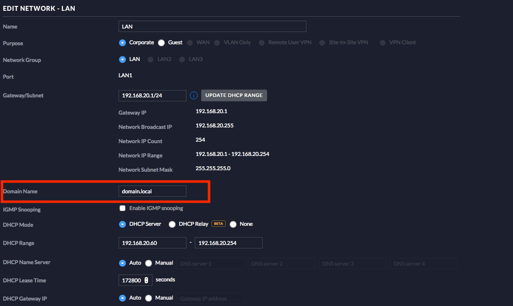 With Postmark you are able to use your domain name create a new email address name on that domain and generate different SMTP. If youre simply trying to set the Domain Name information within the UniFi Controller it can be found under. Settings Networks Edit LAN Domain Name which is a box about halfway down the page directly underneath the GatewaySubnet CIDR notation and DHCP Range info.