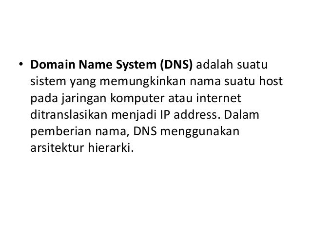 Domain Name System DNS Domain Name System DNS adalah suatu sistem yang memungkinkan nama suatu host pada jaringan komputer atau internet ditranslasikan menjadi IP address. Merupakan database yang berisi daftar informasi host Format penamaan host pada internet dibuat menurut hirarki berdasarkan level domain. Domain Name System DNS adalah suatu sistem yang memungkinkan nama suatu host pada jaringan komputer atau internet ditranslasikan menjadi - 19988594.